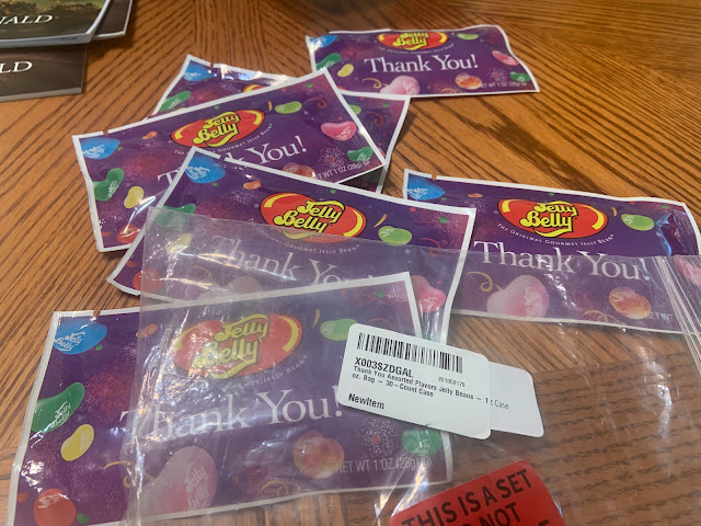 I wanted to give our grandchildren a treat after the lesson I taught on etiquette and manners at our family reunion. I found these cute bags of jelly bellies on Amazon. I thought they were perfect because they said "thank you" on them. The description said there were 30 bags in the case. They were a little less than a dollar a bag. So I ordered a case. When it came, there were just six packages of jelly bellies instead of the promised 30. I got on a chat with an Amazon representative and explained the problem. She said she could refund my money and I could keep the candy. Then I would be able to order it again. So, that's what we did.